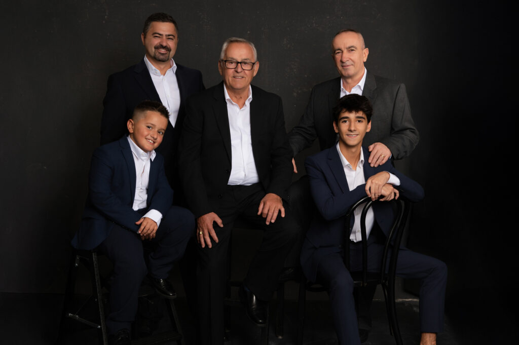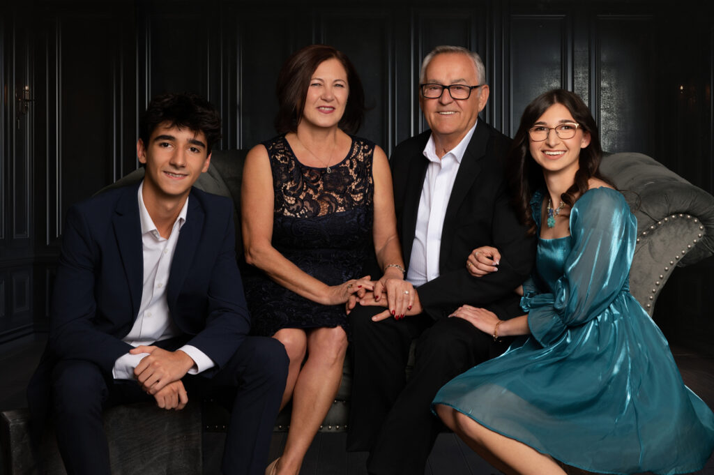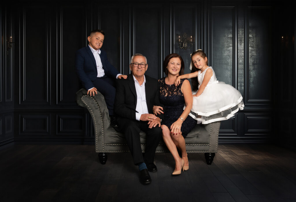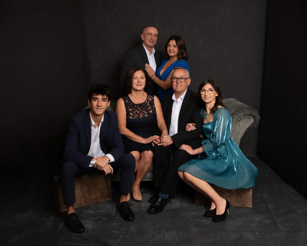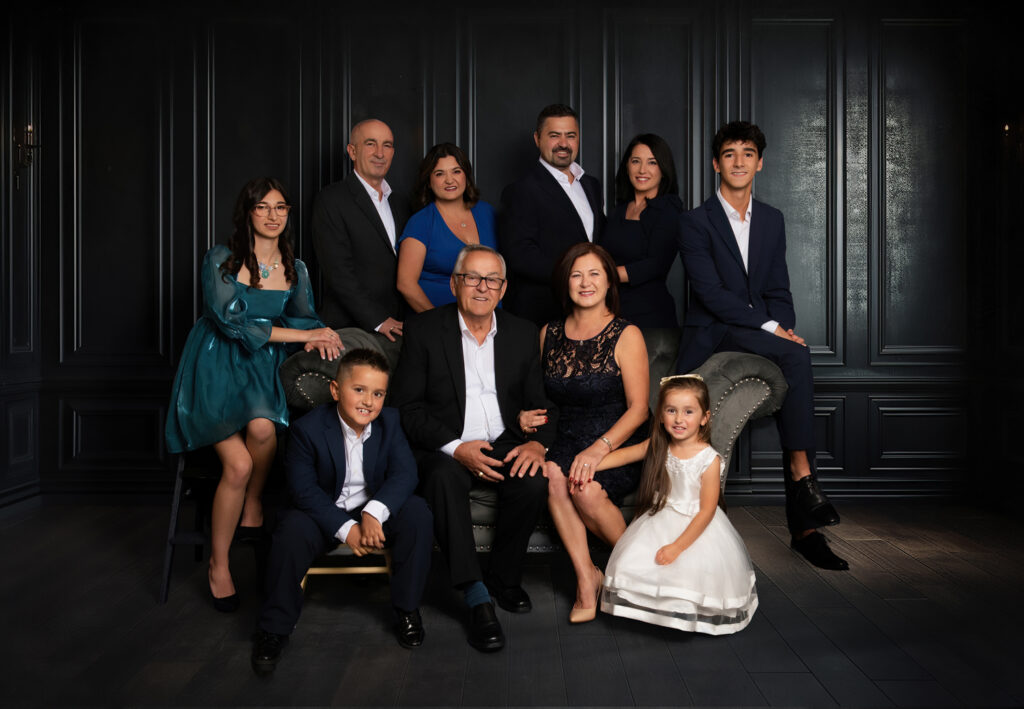 The session included three different setups and two outfit changes, starting in my studio where I guided the family through flattering, natural poses. We photographed the entire group, individual family units, grandparents with grandchildren, and smaller groupings to ensure a complete story.