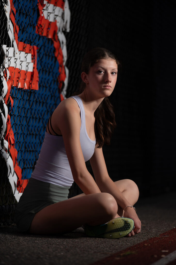 We began with her strength as a runner. Using dynamic lighting, I captured her focus and determination in action. These portraits reflect her power and drive, the qualities that push her forward both on the track and in life.